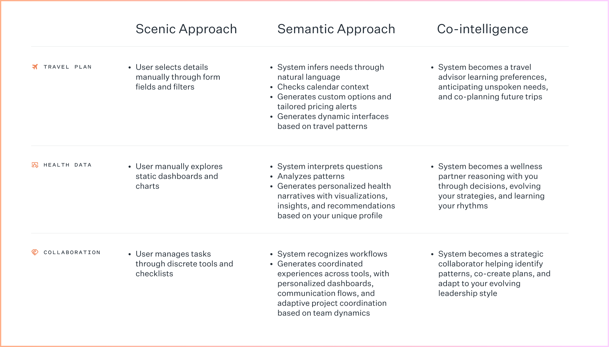 Semantic design flips that model. Instead of designing detailed maps, we’re building intelligent compasses: systems that adapt to intent, interpret goals, and generate personalized paths.